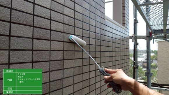 タイル塗装とは、外壁タイルの表面に透明または半透明の塗料(クリヤー塗料)を塗布し、外壁を保護する塗装工事です。