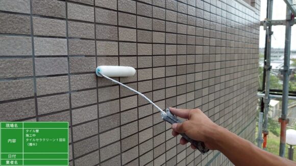 タイル専用プライマーを塗布し、塗料の密着性を高めます。